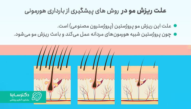 هر نوع روش هورمونی پیشگیری از بارداری، از جمله قرص ضد‌بارداری، برچسب ضد‌بارداری، حلقه واژینال، آمپول ضد‌بارداری و ایمپلنت‌ ممکن است باعث ریزش مو شود. آنچه که در این موارد باعث ریزش مو می‌شود، پروژستین است. برخلاف پروژسترون طبیعی، پروژستین (پروژسترون صناعی) فعالیت آندروژنی دارد؛ یعنی شبیه هورمون‌های مردانه عمل می‌کند. این فعالیت آندروژنیک ممکن است عوارض متعددی از جمله ریزش مو داشته باشد. برخی از انواع آن نیز اثرات آندروژنی بیشتری نسبت به سایرین دارند.