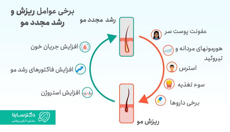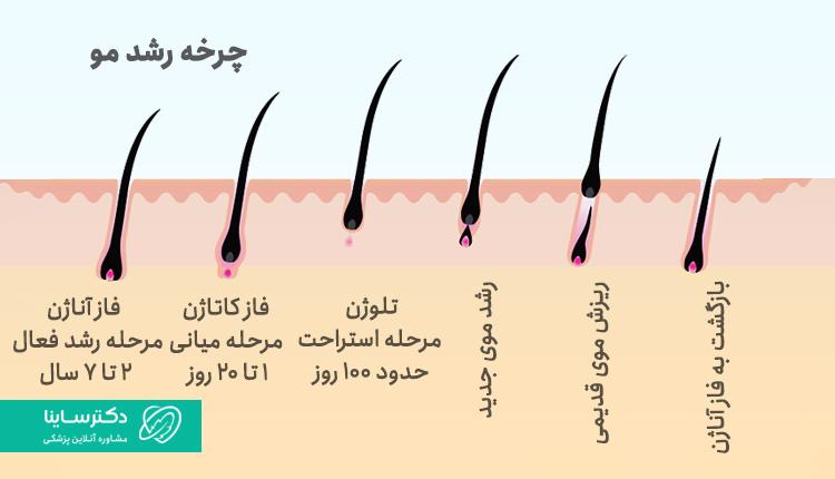 مو به طور معمول یک چرخه رشد دارد. آناژن، فاز فعال این چرخه است. در طول این مرحله، مو از درون فولیکول رشد می‌کند. این مرحله ممکن است ۲ تا ۷ سال طول بکشد. کاتاژن، مرحله میانی است که در آن رشد موها متوقف می‌شود و حدود ۱۰ تا ۲۰ روز طول می‌کشد. تلوژن، مرحله استراحت است. در این مرحله، موهای شما رشد نمی‌کند. روزانه بین ۲۵ تا ۱۰۰ تار مو در این مرحله می‌ریزد و می‎تواند تا حدود ۱۰۰ روز ادامه داشته باشد.